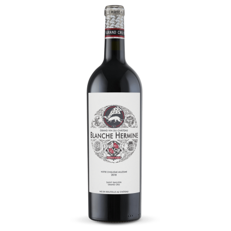 Le Saint Emilion Grand Cru Blanche Hermine 2018 propose un nez de Cabernet Franc marqué par la violette, le fumé et le chocolat.